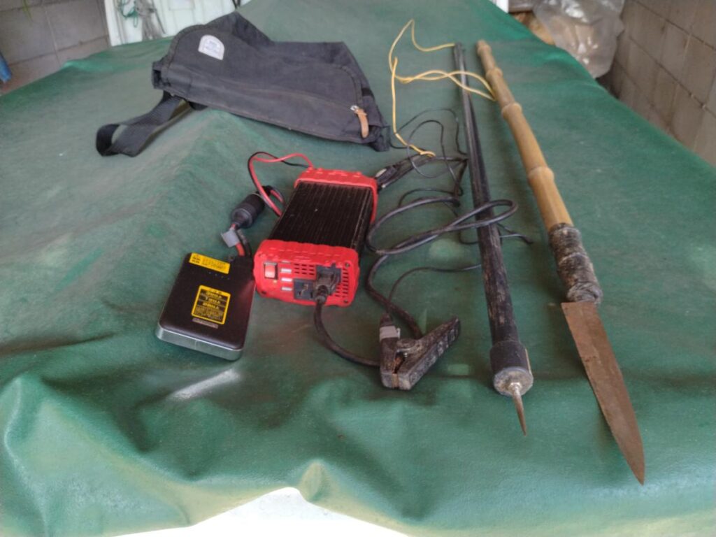次にかかったイノシシを殺すわけだが、この止め刺しは自作した電気止め刺し器を使っている。塩ビパイプの先にステンレスの細いボルトを付けて鋭く研ぎ、電線を3mほどつなぐ。バッテリーは車のバッテリー上がりの時に使うジャンプスターターを購入しスマホの充電コードで充電する。そしてDC/ACインバータを使い片方を矢に、もう片方をワニぐちクリップにつないぐ。